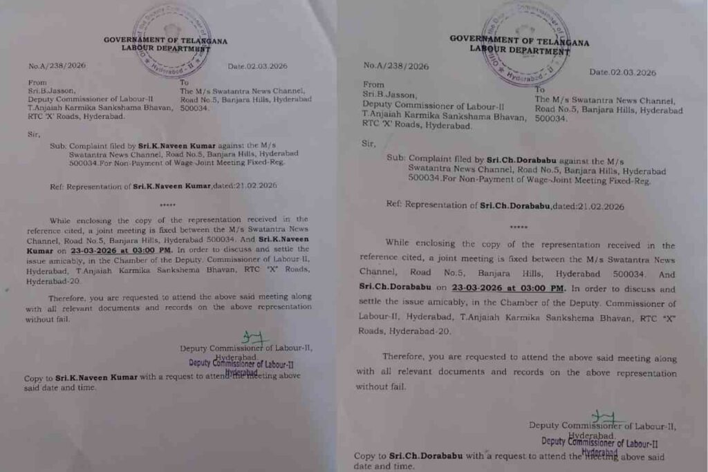 హైదరాబాద్: బంజారాహిల్స్ కేంద్రంగా నిర్వహిస్తున్న ‘స్వతంత్ర’ న్యూస్ ఛానల్ యాజమాన్యానికి తెలంగాణా కార్మిక శాఖ నోటీసులు జారీ చేసింది. ఈ ఛానల్ కు చెందిన ఉద్యోగులు కె. నవీన్ కుమార్, సీహెచ్. దొరబాబు చేసిన ఫిర్యాదు మేరకు హైదరాబాద్ -2 డిప్యూటీ లేబర్ కమిషనర్ (డీసీఎల్) బి. జాసన్ ఈ నోటీసులు జారీ చేశారు. ఫిర్యాదుదారులతో ఈనెల 23వ తేదీన మధ్యాహ్నం 3.00 గంటలకు నిర్వహించే జాయింట్ మీటింగ్ కు హాజరు కావలసిందిగా ఆయన న్యూస్ ఛానల్ యాజమాన్యాన్ని ఆదేశించారు.