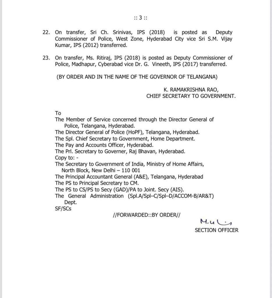 రాష్ట్ర వ్యాప్తంగా 23 మంది ఐపీఎస్ అధికారులను బదిలీ చేస్తూ తెలంగాణా ప్రభుత్వం ఉత్తర్వు జారీ చేసింది. ఆర్టీసీ మేనేజింగ్ డైరెక్టర్ గా పనిచేస్తున్న వీసీ సజ్జన్నార్ ను హైదరాబాద్ నగర పోలీస్ కమిషనర్ గా నియమిస్తూ, ఇక్కడ గల సీవీ ఆనంద్ ను హోంశాఖ స్పెషల్ సెక్రెటరీగా నియమించింది. అదేవిధంగా వై. నాగిరెడ్డిని ఆర్టీసీ ఎండీగా నియమించారు. బదిలీకి గురైన ఐపీఎస్ అధికారుల పూర్తి వివరాలను దిగువన గత ఉత్తర్వు ప్రతిలో చూడవచ్చు.