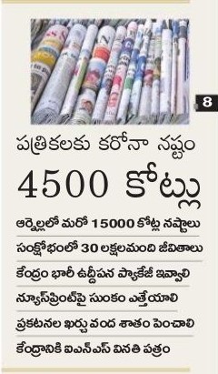 పత్రికా రంగానికి ప్రత్యేక ఉద్దీపన ప్యాకేజీ అడుగుతున్నారు. లాక్ డౌన్ పరిణామాల వల్ల ఇప్పటికే రూ. 4 వేల కోట్ల రూపాయలను నష్టపోయామంటున్నారు. ప్రభుత్వం ఉపశమనం కలిగించకపోతే వచ్చే ఆరేడు నెలల్లో రూ. 15 వేల కోట్ల రూపాయల వరకు నష్టపోవలసి ఉంటుందట. గడచిన రెండు నెలల్లోనే రూ. 4,500 కోట్ల మేర ఆదాయాన్ని కోల్పోయారట. ఇంకా అనేక రకాల నష్టాలను వివరిస్తూ పత్రికా సంస్థలకు రెండేళ్ల పన్ను విరామాన్ని కూడాప్రకటించాలని కోరారు. ‘బ్యూరో ఆఫ్ ఔట్ రీచ్ అండ్ కమ్యునికేషన్’ అడ్వర్టయిజ్మెంట్ల రేటును 50 శాతం పెంచాలంటున్నారు. ప్రింట్ మీడియా కోసం ఉద్దేశించిన బడ్జెట్ ను నూటికి నూరు శాతం పెంచాలంటున్నారు. ఆయా కోరికలతో పత్రికాధిపతుల తరపున ఇండియన్ న్యూస్ పేపర్ సొసైటీ కేంద్ర ప్రభుత్వానికి విన్నవించింది.
