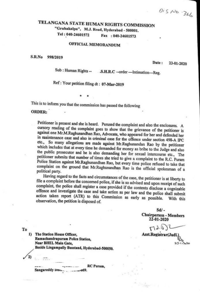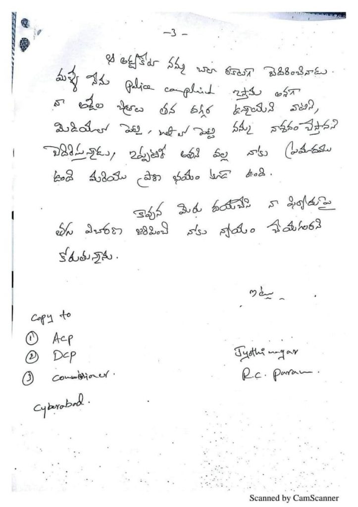 బీజేపీ నేత రఘునందన్ రావు తనపై అత్యాచారం చేశాడని ఆరోపణలు చేసిన ఓ మహిళ పోలీసులకు ఇచ్చిన ఫిర్యాదులో పూర్తి వివరాలు ఏమున్నాయ్? ఎప్పుడో 13 ఏళ్ల క్రితం జరిగినట్లు పేర్కొన్న సంఘటనపై ఆ మహిళ ఇప్పుడు పోలీసులకు ఫిర్యాదు చేసిన ఘటన తెలంగాణాలో రాజకీయంగా తీవ్ర చర్చకు దారి తీసింది. హెచ్చార్సీని ఆశ్రయించి తనకు న్యాయం చేయాలని అభ్యర్థించిన ఆ మహిళ సైబరాబాద్ పోలీస్ కమిషనర్ సజ్జన్నార్ కు కూడా ఫిర్యాదు చేశారు. అయితే తనపై వచ్చిన ఆరోపణలను రఘునందన్ రావు ఖండించారు. రాజకీయ కుట్రగా అభివర్ణించారు. ప్రశ్నించేవారిపై ప్రభుత్వం తప్పుడు కేసులు పెట్టే కుట్రలో భాగమని ఆయన పేర్కొన్నారు. రఘునందన్ రావుపై మహిళ పోలీసులకు చేసిన ఫిర్యాదు ప్రతిని దిగువన చూడవచ్చు.