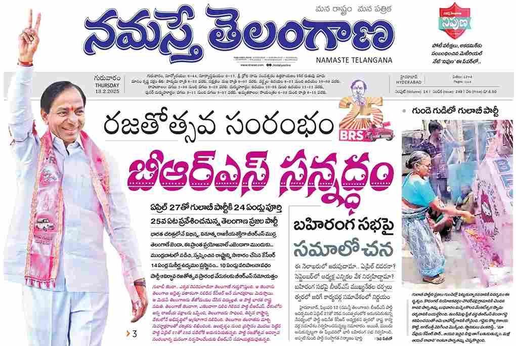 ఆయా పరిణామాల్లో కేసీఆర్ మానస ‘పత్రిక’ నమస్తే తెలంగాణా గురువారం సంచలన రీతిలో స్పందించినట్లు ఓ వార్తా కథనాన్ని ప్రచురించింది. ‘రజతోత్సవ సంరంభం, బీఆర్ఎస్ సన్నద్ధం’ శీర్షికతో బ్యానర్ స్టోరీని ప్రచురించడం విశేషం. బీఆర్ఎస్ చీఫ్ కేసీఆర్ గుండె నిండుగా నవ్వుతున్న నిలువెత్తు ఫొటోను కూడా ఈ వార్తకథనంలో ప్రచురించింది. మొదటి పేజీ బ్యానర్ స్టోరీలో ఇంట్రోను ఇచ్చిన పత్రిక మూడో పేజీలో దాదాపు ముప్పాతిక పేజీ స్థలంలో వార్తా కథనాన్ని ప్రచురించడం ప్రత్యేకత.