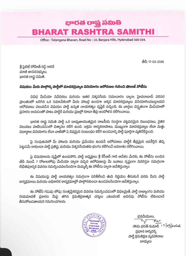 పైలెట్ రోహిత్ రెడ్డికి బీఆర్ఎస్ జారీ చేసిన షోకాజ్ నోటీస్ ప్రతిని దిగువన చూడవచ్చు..
