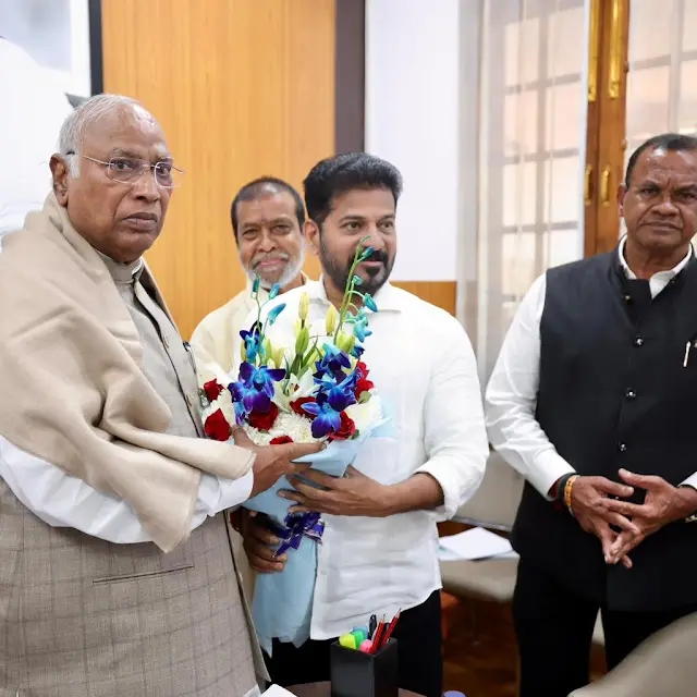 ఢిల్లీ: తెలంగాణ సీఎం రేవంత్ రెడ్డితోపాటు పలువురు మంత్రులు గురువారం కాంగ్రెస్ పార్టీ జాతీయ నాయకత్వాన్ని కలిశారు. రాష్ట్ర అభివృద్ధి పథాన్ని మరింత వేగవంతం చేయాలనే దృఢ సంకల్పంతో ఆయా నాయకులు పార్టీ అగ్రనేతలను కలిసినట్లు అధికారిక ప్రకటన వెలువడింది. ముఖ్యమంత్రి రేవంత్ నేతృత్వంలోని ప్రతినిధి బృందం ఏఐసీసీ అధ్యక్షుడు, రాజ్యసభలో ప్రతిపక్ష నేత మల్లికార్జున ఖర్గేను, లోక్సభలో ప్రతిపక్ష నేత రాహుల్ గాంధీని మర్యాదపూర్వకంగా కలిసి రాష్ట్ర అభివృద్ధిపై చర్చించినట్లు ఆ ప్రకటన పేర్కొంది.