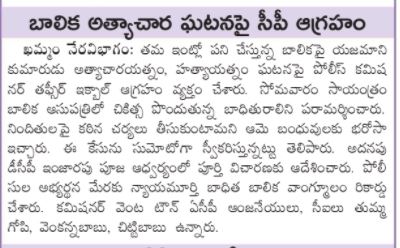 అసలు విషయమేమిటంటే…? ఓ 13 ఏళ్ల బాలికపై ఖమ్మం నగరంలో ఘోర అఘాయిత్య ఘటన జరిగిన సంగతి తెలిసిందే. ఓ సంపన్న కుటుంబం ఇంట్లో పనిచేస్తున్న బాలికపై ఆ ఇంటి యజమాని కుమారుడు అత్యాచారయత్నానికి పాల్పడగా, బాలిక ప్రతిఘటించింది. దీంతో బాలికపై పెట్రలో పోసి ఇంటి యజమాని కుమారుడు నిప్పంటించాడు. ఇదే విషయాన్ని స్పెషల్ మొబైల్ కోర్టు మేజిస్ట్రేట్ జస్టిస్ ఉషశ్రీ ముందు బాలిక తన మరణ వాంగ్మూలంగా ఇచ్చింది. డెబ్బయి శాతానికి పైగా శరీరం కాలిన ఆ బాలిక ప్రాణాపాయ స్థితిలో ప్రస్తుతం ఆసుపత్రిలో చికిత్స పొందుతోంది.