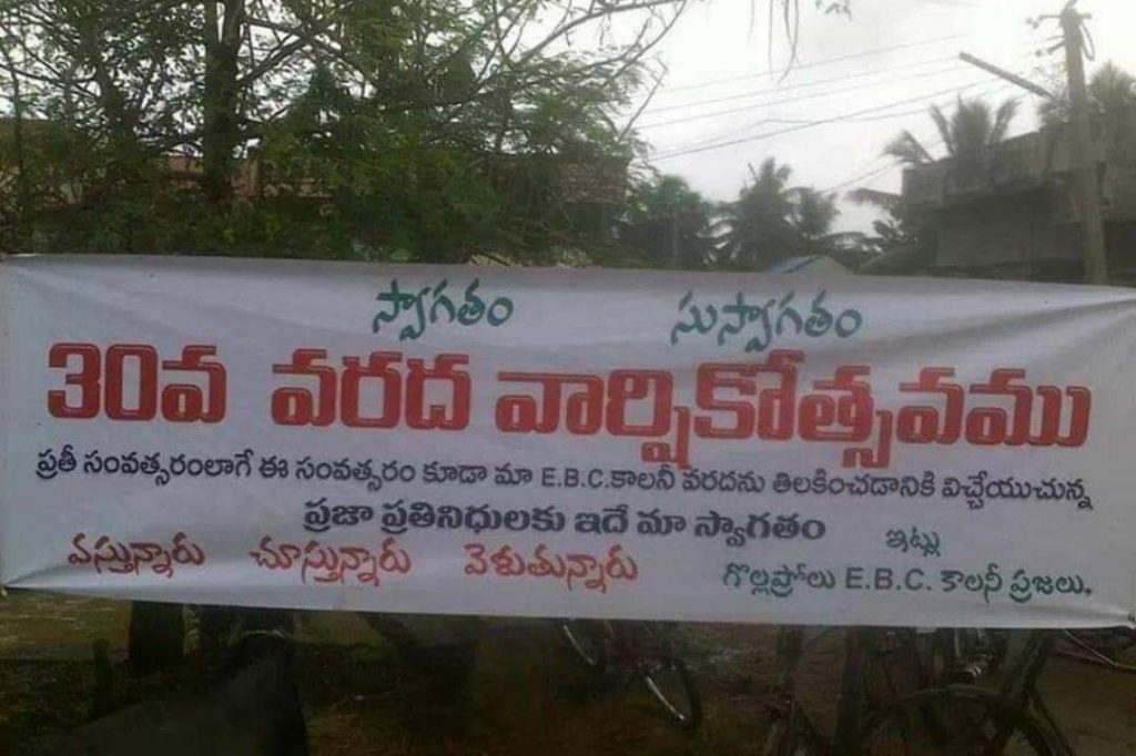 ఈ బ్యానర్ ద్వారా గొల్లప్రోలు ఈబీసీ కాలనీవాసులు చెబుతున్నదేమిటంటే… అక్కడ వరద వార్షికోత్సవాన్ని నిర్వహిస్తున్నారట. వరదకు వార్షికోత్సవం ఏమిటి? అని ఆశ్చర్యపోకండి. అదే మరి తూ.గో. జిల్లా ఎటకారమంటే!