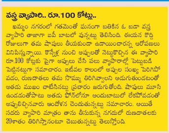 ఈ నేపథ్యంలోనే ఖమ్మం నగరంలోని ప్రముఖ వ్యాపారులు కొందరు ఇటీవల అడ్రస్ దొరక్కుండా తప్పించుకుని తిరుగుతున్నట్లు మీడియాలో ఇప్పటికే పలు కథనాలు వచ్చాయి. ప్రధాన పత్రికలతోపాటు మరికొన్ని పత్రికలు, ఇతర మాధ్యమాలు కూడా భిన్న కథనాలు ప్రచురించి, ప్రసారం చేశాయి. భారీ ఎత్తున.. అంటే సుమారు 180 నుంచి 200 కోట్ల పైచిలుకు వరకు అప్పులు చేసిన ఖమ్మంలోని ఓ ప్రముఖ వ్యాపారి గత కొన్ని నెలలుగా తన వ్యాపార సంస్థను మూసేసి తప్పించుకు తిరుగుతున్నట్లు వార్తల సారాంశం. ఖమ్మం వ్యవసాయ మార్కెట్ లో కార్యకలాపాలు సాగించే ఓ ఖరీదుదారు కూడా దాదాపు 40 కోట్ల వరకు అప్పులు చేసి ఉడాయించినట్లు ప్రచారం జరుగుతోంది.