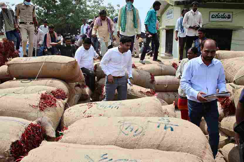 ఈ సందర్భంగా మిర్చి యార్డును కలియదిరిగి కొనుగోళ్ళ తీరును పరిశీలించారు. గిట్టుబాటు ధరకే మిర్చి కొనుగోలు చేయాలని వ్యాపారులకు కలెక్టర్ సూచించారు. తేమశాతం కోసం మిరపకాయలు పట్టుకుని నాణ్యతను పరిశీలించిన కలెక్టర్, సరుకు బాగానే ఉన్నా తక్కువ ధర చెల్లిస్తున్న వ్యాపారుల తీరుపై ఆగ్రహం వ్యక్తం చేశారు. నాణ్యతను వ్యాపారులు ఎలా నిర్ధారిస్తారని అధికారులను ప్రశ్నించారు. మార్కెట్కు వచ్చిన కలెక్టర్ తో మిర్చి రైతులు, మిర్చి ధరలు గణనీయంగా తగ్గిస్తున్నారని ఆవేదనను వ్యక్తం చేశారు. జెండా పాటకు వేలం వ్యత్యాసంతో వ్యాపారులు మిర్చి కొనుగోళ్లు చేస్తున్నారు. దీంతో చాలా నష్టాలు వస్తున్నాయని రైతులు తెలిపారు. రైతులతో మాట్లాడిన కలెక్టర్ వారికి న్యాయం చేస్తానని హామీ ఇచ్చారు.