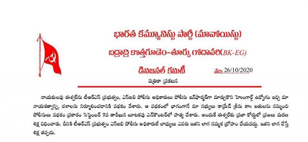 ఈ నేపథ్యంలో మావోయిస్టు పార్టీ భద్రాద్రి కొత్తగూడెం-తూర్పుగోదావరి జిల్లాల డివిజనల్ కమిటీ కార్యదర్శి ఆజాద్ పేరుతో సోషల్ మీడియా ద్వారా ఓ ప్రకటన విడుదలైంది. టీఆర్ఎస్ ప్రభుత్వం, ఎస్ఐబీ పోలీసు అధికారులు ఈశ్వర్ ను పోలీస్ ఇన్ఫార్మర్ గా మార్చుకున్నారని ఆజాద్ ఆరోపించారు. అతనికి హోంగార్డు ఉద్యోగం ఇచ్చి తమ నాయకత్వాన్ని, దళాలను నిర్మూలించేందుకు పథకం వేశారన్నారు.