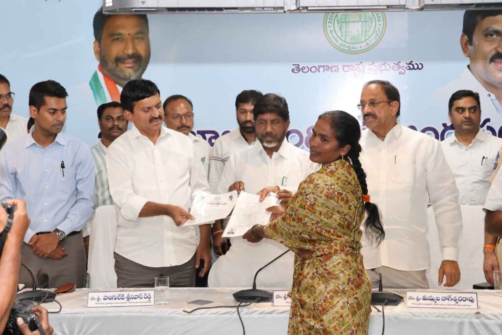 వెలుగుమట్ల బాధితురాలికి ఇంటి స్థలం పట్టా కాగితాన్ని అందిస్తున్న మంత్రి పొంగులేటి, చిత్రంలో డిప్యూటీ సీఎం భట్టి, వ్యవసాయ మంత్రి తుమ్మల తదితరులు