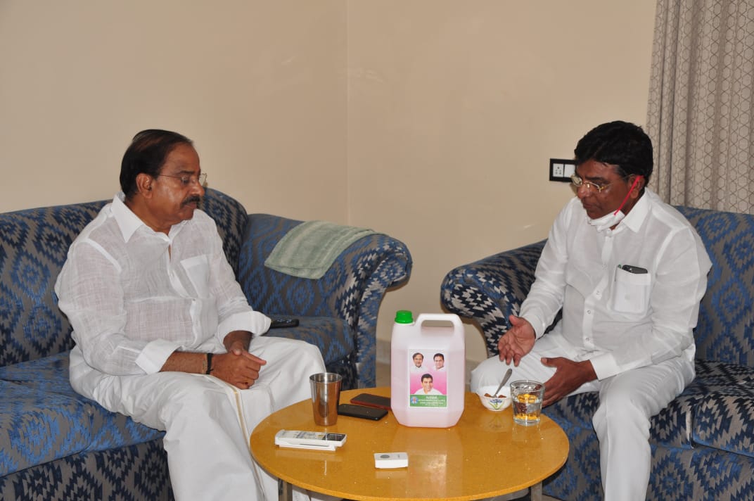 తాజా రాజకీయ పరిణామాల్లో ఖమ్మం జిల్లాలో ఆధిపత్య రాజకీయాలు తారుమారైన సంగతి తెలిసిందే. గత ఎన్నికల్లో ఓటమి అనంతరం అయితే హైదరాబాద్, లేదంటే ఖమ్మం జిల్లా సత్తుపల్లిలోని గండుగులపల్లిలో గల తన నివాసంలో తుమ్మల రాజకీయంగా విశ్రాంతి తీసుకుంటున్నారు. ఎంపీ నామా నాగేశ్వరరావు సత్తుపల్లి ప్రాంతంలో పర్యటించిన సందర్భాల్లో అప్పుడప్పుడు ఇలా తుమ్మలను కలుస్తుండడం విశేషం. శనివారం కూడా నామా నాగేశ్వరరావు తుమ్మల నాగేశ్వరరావును సత్తుపల్లి సమీపంలోని పాకాలగూడెంలో కలిశారు. కరోనా నేపథ్యంలో తాను తయారు చేయించిన శానిటైజర్ క్యాన్ ను తుమ్మలకు నామా ఈ సందర్భంగా అందించిన దృశ్యమిది.