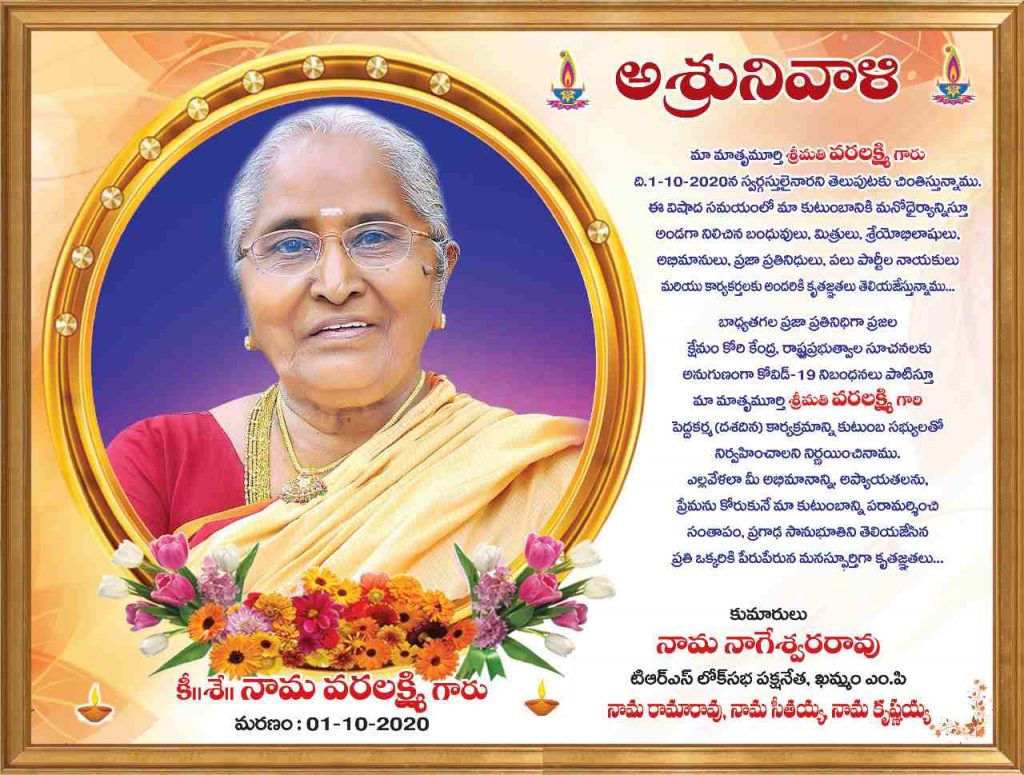 తమ మాతృమూర్తి శ్రీమతి వరలక్ష్మి ఈనెల 1వ తేదీన స్వర్గస్తులైన విషయాన్ని తెలుపుటకు చింతిస్తున్నామని నామా సోదరులు నామా నాగేశ్వరరావు, నామా రామారావు, నామా సీతయ్య, నామా కృష్ణయ్యలు తెలిపారు. ఈ విషాద సమయంలో తమ కుటుంబానికి మనోధైర్యాన్ని ఇస్తూ అండగా నిలిచిన బంధువులు, మిత్రులు, శ్రేయోభిలాషులు, అభిమానులు, ప్రజా ప్రతినిధులు, పలు రాజకీయ పార్టీల నాయకులకు, కార్యకర్తలకు అందరికీ కృతజ్ఞతలు తెలియజేస్తున్నట్లు ఎంపీ నామా తెలిపారు.