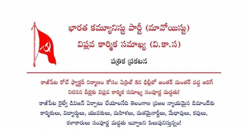 ఈ నేపథ్యంలోనే మావోయిస్టు పార్టీ అనుబంధ సంస్థ విప్లవ కార్మిక సమాఖ్య (వికాస) పేరుతో వెలువడిన ఓ ప్రకటన పోలీసు వర్గాలను అప్రమత్తం చేసింది. కాజీపేట కోచ్ ఫ్యాక్టరీ నిర్మాణం కోసం వచ్చే నెల 5న ఢిల్లీలోని జంతర్ మంతర్ వద్ద నిర్వహించే నిరసన దీక్షకు తాము సంపూర్ణ మద్ధతు ప్రకటిస్తున్నట్లు వికాస కార్యదర్శి ఆజాద్ పేరుతో ఓ ప్రకటన విడుదలైంది. ఇప్పుడీ ప్రకటన తెలంగాణా పోలీసు వర్గాల్లో కలకలాన్ని కలిగిస్తోంది. సంఘటిత, అసంఘటిత రంగాలకు చెందిన కార్మిక సంఘాల్లో నక్సల్స్ పట్టుకోసం ప్రయత్నిస్తున్నారా? అనే సంశయాలను పోలీసు వర్గాలు వ్యక్తం చేస్తున్నాయి. ఇందుకు సంబంధించి పూర్తి సమాచార సేకరణలో ప్రభుత్వ నిఘా వర్గాలు నిమగ్నమయ్యాయి.