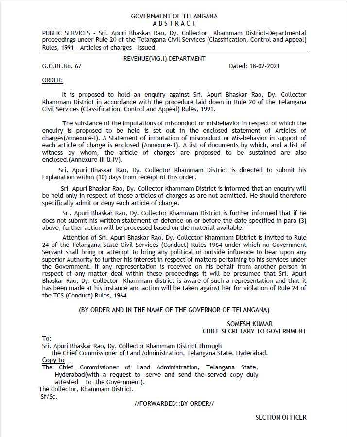 తెలంగాణా ప్రభుత్వ ప్రధాన కార్యదర్శి సోమేష్ కుమార్ పేరున నిన్న విడుదలైన ఉత్తర్వు ఒకటి రాత్రి బాగా పొద్దుపోయాక వెలుగులోకి వచ్చింది. ఈ ఉత్తర్వు సారాంశమేమిటంటే… ఏపూరి భాస్కర్ రావు అనే డిప్యూటీ కలెక్టర్ పై పెండింగ్ లో గల ఆరోపణలపై విచారణకు ఆదేశించడం. ఈమేరకు జీవో ఆర్టీ నెం. 67 ద్వారా ఉత్తర్వును జారీ చేశారు. దుష్ప్రవర్తన, దుర్వినియోగం వంటి ఆరోపణలపై సంజాయిషీని కోరుతూ విచారణకు ఆదేశించారు. ఉత్తర్వు అందిన పది రోజుల్లోగా వివరణ ఇవ్వాలని కూడా నిర్దేశించారు.