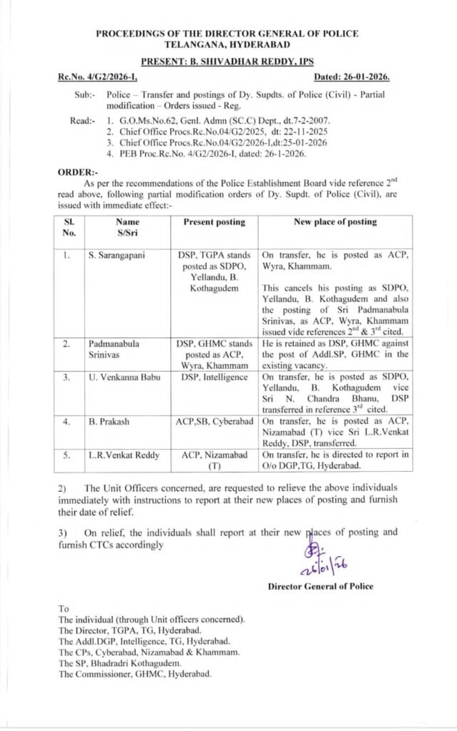 ఇల్లెందు డీఎస్పీగా పోస్టింగ్ ఇచ్చిన ఎస్. సారంగపాణిని వైరా ఏసీపీగా బదిలీ చేస్తూ మార్పు చేశారు. ఇల్లెందు డీఎస్పీగా ఇంటెలిజెన్స్ లో గల యు. వెంకన్నబాబును బదిలీ చేశారు. అదేవిధంగా వైరా ఏసీపీగా పోస్టింగ్ ఇచ్చిన పద్మనాభుల శ్రీనివాస్ ను తిరిగి జీహెచ్ఎంసీ అదనపు ఎస్పీగా పోసింగ్ ఇచ్చారు. సైబరాబాద్ స్పెషల్ బ్రాంచ్ విభాగపు ఏసీపీగా ఉన్నటువంటి బి. ప్రకాష్ ను నిజామాబాద్ ఏసీపీగా, అక్కడ పనిచేస్తున్న ఎల్ఆర్ వెంకటరెడ్డిని డీజీపీ ఆఫీసులో రిపోర్ట్ చేయాల్సిందిగా ఆదేశిస్తూ ఉత్తర్వు వెలువడింది.