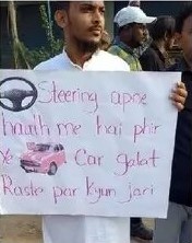 దిగువన గల ఈ ఫొటోలను నిశితంగా పరిశీలించండి. ‘స్టీరింగ్ మా చేతిలోనే ఉన్నా..కారు తప్పుడు మార్గంలో ఎందుకు వెడుతోంది’ (స్టీరింగ్ అప్నే హాత్ మే హై..ఫిర్ యే కార్ గలత్ రాస్తే పర్ క్యూ జారీ?) అన్నది ప్లకార్డులోని సారాంశం. స్టీరింగ్, కారు, దానిపై టీఆర్ఎస్ జెండా గల చిత్రాలను ఓ యువకుడు ప్ల కార్డుపై ప్రదర్శించడం గమనార్హం.