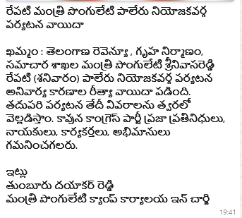 అదేవిధంగా రెవెన్యూ మంత్రి పొంగులేటి శ్రీనివాసరెడ్డి ఖమ్మం జిల్లా పర్యటనలు కూడా అర్థంతరంగా వాయిదా పడ్డాయి. శుక్ర, శనివారాల్లో ఆయన జిల్లాలో పర్యటిస్తారని అధికారిక ప్రకటనలు వెలువడ్డాయి. అయితే ఈ పర్యటనలు అనివార్య కారణాలవల్ల వాయిదా పడినట్లు ఏరోజుకారోజు అవే అధికారిక ప్రకటనలు వెల్లడించాయి. మొత్తం సీఎం నుంచి వచ్చిన అత్యవస పిలుపు మేరకే అటు పొంగులేటి తన పర్యటనలను వాయిదా వేసుకోగా, ఇటు తుమ్మల అత్యవసరంగా పెళ్లి వేదిక నుంచే పయనమై హైదరాబాద్ చేరుకున్నారు.