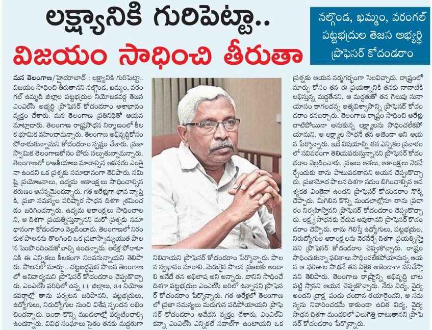 ఈ నేపథ్యంలో ‘మన తెలంగాణా’ పత్రికలో ఈరోజు ప్రత్యేక విశేషం ఏమిటో తెలుసా? వరంగల్, ఖమ్మం, నల్లగొండ గ్రాడ్యుయేట్ ఎమ్మెల్సీ ఎన్నికల్లో తలపడుతున్న టీజేఎస్ అధ్యక్షుడు ప్రొఫెసర్ కోదండరాం వార్తా కథనానికి ఈ పత్రిక ప్రమఖ స్థానాన్ని కల్పించింది. మెయిన్ ఎడిషన్ మూడో పేజీలో కోదండరాం ఫొటోతో మూడు కాలాల వార్తను ప్రచురించడమే చర్చనీయాంశంగా మారింది. ఎమ్మెల్సీ ఎన్నికల నేపథ్యంలో ‘పెయిడ్ ఆర్టికల్’ కాదుగా…? అని సందేహిస్తున్నవారూ లేకపోలేదు. అయినా ప్రొఫెసర్ సార్ పెయిడ్ ఆర్టికల్ ఎందుకు పబ్లిష్ చేయించుకుంటారు? అనే ప్రశ్నలు కూడా ఉన్నాయి. అబ్బే… అదేమీ లేదు ‘మన తెలంగాణా’ బ్యాలెన్సుడ్ జర్నలిజానికి ప్రతీకంగా పేర్కొంటే మాత్రం ఖచ్చితంగా అది కోదండరాం సార్ అభిమానులు ‘సంతోష’పడాల్సిన అంశమే!