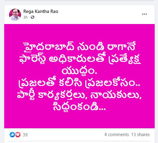 ప్రభుత్వ విప్, భద్రాద్రి కొత్తగూడెం జిల్లా పినపాక ఎమ్మెల్యే రేగా కాంతారావు అటవీ శాఖ అధికారులపై వివాదాస్పద వ్యాఖ్యలు చేశారు. అటవీ అధికారులతో ప్రత్యక్ష యుద్ధానికి సిద్ధం కావలసిందిగా ఆయన పిలుపునివ్వడం సంచలనం కలిగిస్తోంది. తన పేరున గల ఫేస్ బుక్ పేజీలో కాంతారావు అటవీ శాఖ అధికారులపై వివిధ వ్యాఖ్యలతో కూడిన పోస్టులు పెట్టారు. అయితే ఈ ఫేస్ బుక్ పేజీని తానే స్వయంగా నిర్వహిస్తున్నారా? లేక తన సోషల్ మీడియా కార్యకర్తలు నిర్వహిస్తున్నారా? అనే ప్రశ్నలపై స్పష్టత లేదు.