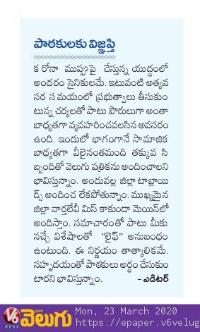ఇకపోతే కరోనా ముప్పు నేపథ్యంలో తమ వంతు బాధ్యతగా చర్యలు తీసుకుంటున్నట్లు సుమారు ఏడాదిన్నర క్రితం మార్కెట్లోకి వచ్చిన ‘ప్రభాత వెలుగు’ దినపత్రిక యాజమాన్యం కూడా ప్రకటించింది. సామాజిక బాధ్యతతో వీలైనంత తక్కువ సిబ్బందితో పత్రికను అందించాలని భావిస్తున్నామని, అందువల్ల జిల్లా టాబ్లాయిడ్లను అందించలేకపోతున్నట్లు ప్రకటించింది. ఇదిలా ఉండగా తెలంగాణాలో అధికార పార్టీ పత్రిక ‘నమస్తే తెలంగాణా’ యాజమాన్యం కూడా జిల్లా టాబ్లాయిడ్ల ఎత్తివేతపై కొంత కాలం క్రితం నిర్ణయం తీసుకున్నట్లు సమాచారం. ఎందువల్లనో అది అమలు కాలేదని ఆ సంస్థ ఉద్యోగవర్గాలు చెబుతున్నాయి. కరోనా ప్రభావం వల్ల ఆయా ప్రతిపాదన ప్రస్తుతం అమలైనా ఆశ్చర్యం లేదంటున్నారు. తెలుగు ప్రింట్ మీడియాలో కరోనా ప్రభావం మరెన్ని పరిణామాలకు, చర్యలకు దారి తీస్తుందో చూడాలి.