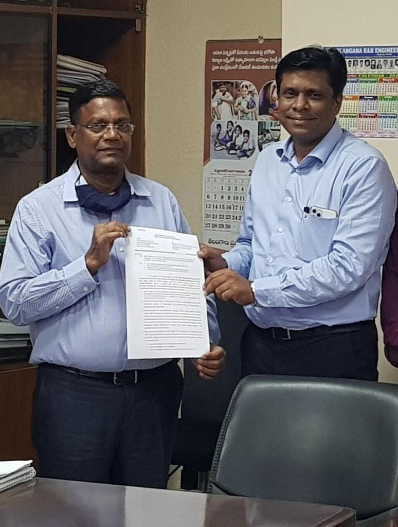 ఆర్ అండ్ బీ ఇంజనీర్ ఇన్ చీఫ్ గణపతి రెడ్డి నుంచి అంగీకార పత్రాన్ని స్వీకరిస్తున్న షాపూర్ జీ-పల్లోంజీ కంపెనీ రీజనల్ హెడ్ లక్ష్మణ్ అగర్వాల్