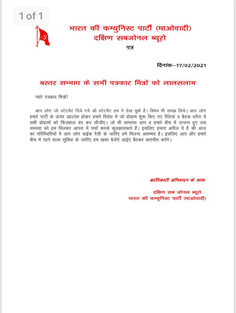 తమకు వ్యతిరేకంగా ప్రజలను సమీకరించి చేస్తున్న ఆందోళలను, ర్యాలీలను, సమావేశాల వంటి అన్ని కార్యక్రమాలను నిలిపివేయాల్సిందిగా మావోయిస్టు పార్టీ బీజాపూర్ జర్నలిస్టులను అభ్యర్థించింది. ఇరు వర్గాల మధ్య ఏ సమస్య తలెత్తినా కలిసి చర్చించడం ద్వారా సమస్యను పరిష్కరించుకుందామని సూచించింది. ‘బస్తర్ ప్రాంత విలేకరులకు లాల్ సలామ్’ పేరుతో ఆ పార్టీ జారీ చేసిన ప్రకటనను దిగువన చూడవచ్చు.